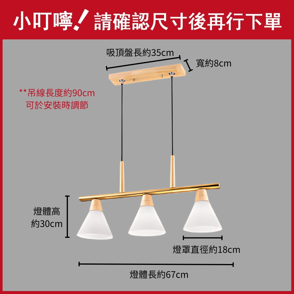 品名 堅持 3 原木/吊燈 (吸頂盤寬約8cm) 材質 金屬/原木燈體 + 玻璃燈罩 尺寸 燈體長約67cm * 高約30cm * 燈罩直徑約18cm 吸頂盤長約35cm * 寬約8cm (附線約90cm 可縮短調整) 光源 需另購E27燈頭燈泡*3 適用 適用約3-4坪
