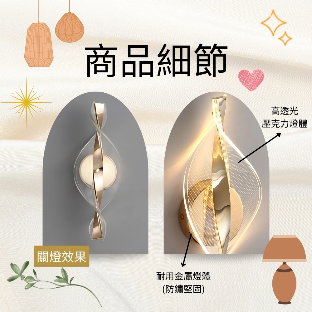 品名 LED 12W 旋律壁燈 (三色光) 材質 金屬 + 壓克力燈體 尺寸 燈體長約13cm * 高度約32cm * 深約13cm 吸頂盤直徑約12cm 光源 內附LED 12W (可壁切三色變光:白/黃/自然光) 適用 適用約1坪