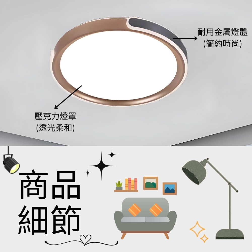 品名 LED 50W(金+灰) 知性調光調色吸頂燈 (附遙控器) 材質 金屬燈體、壓克力燈罩 尺寸 直徑約50cm * 高度約10cm 光源 內附LED 50W光源 (附遙控器/可調光調色) 適用 約4-5坪