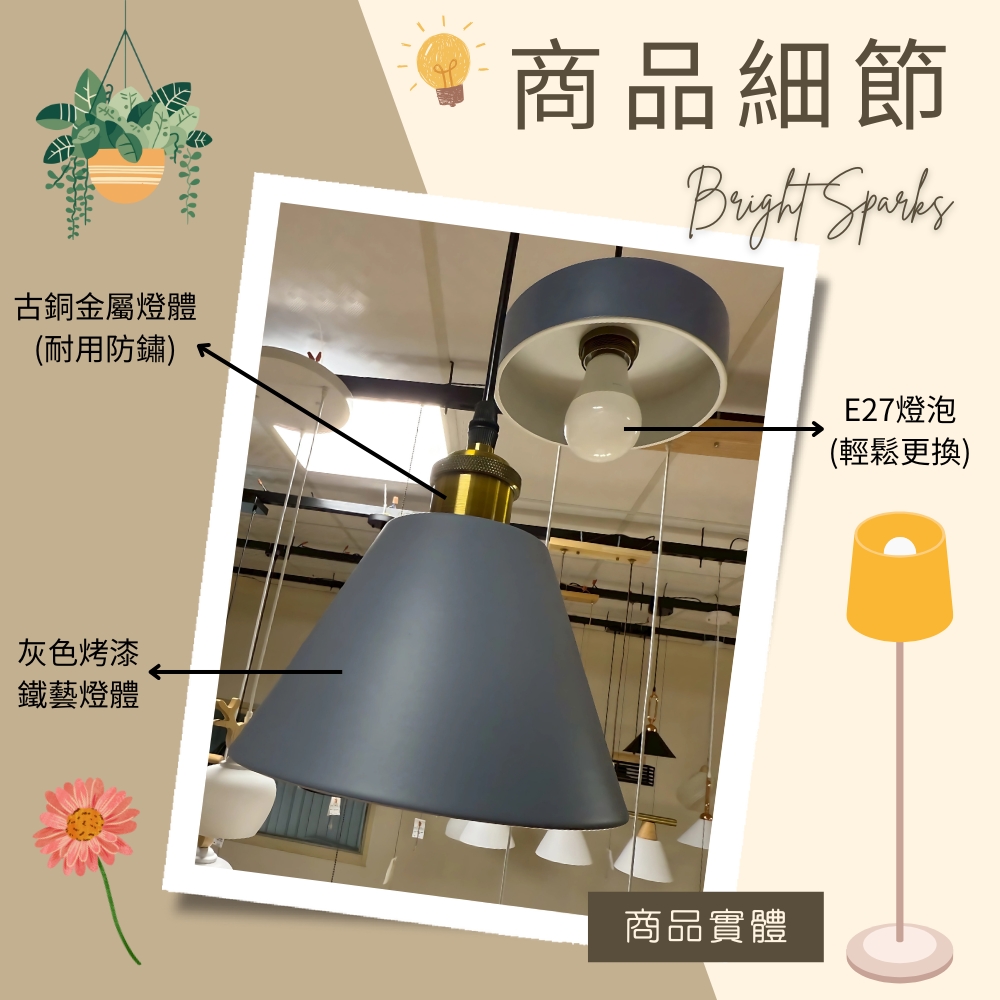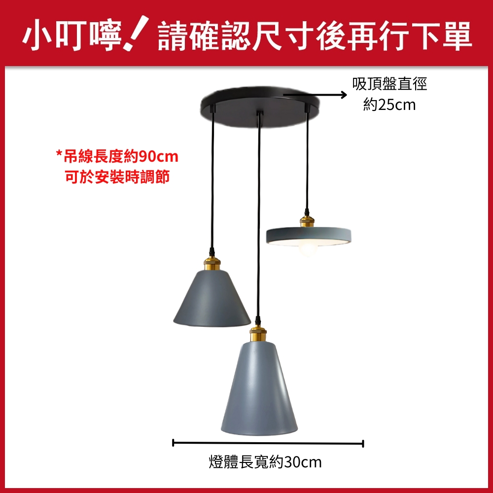 品名 慢慢 3 吊燈 (灰色) 材質 金屬灰色/金燈體 + 灰色烤漆鐵罩 尺寸 燈體長寬約30cm * 吸頂盤直徑約25cm (附線約90cm 可縮短調整) 光源 需另購E27燈頭燈泡*3 適用 適用約3-4坪