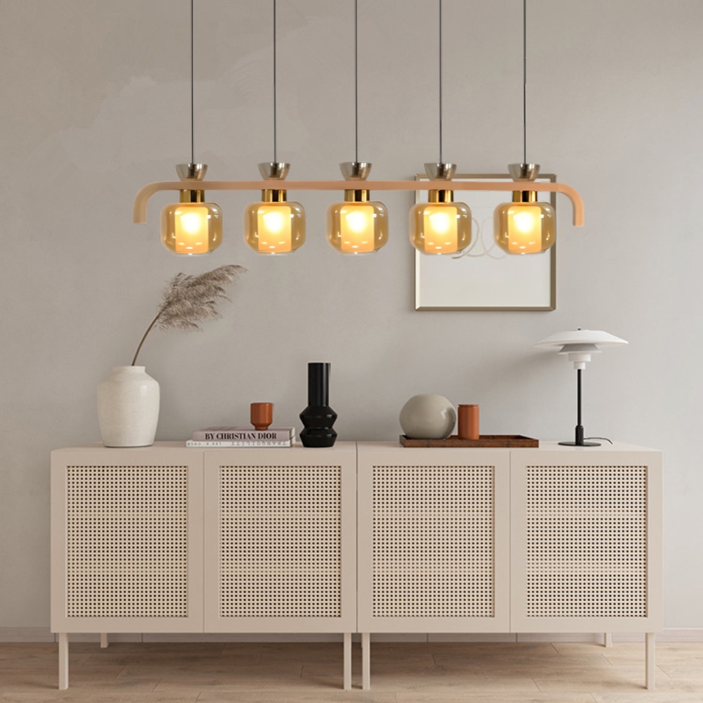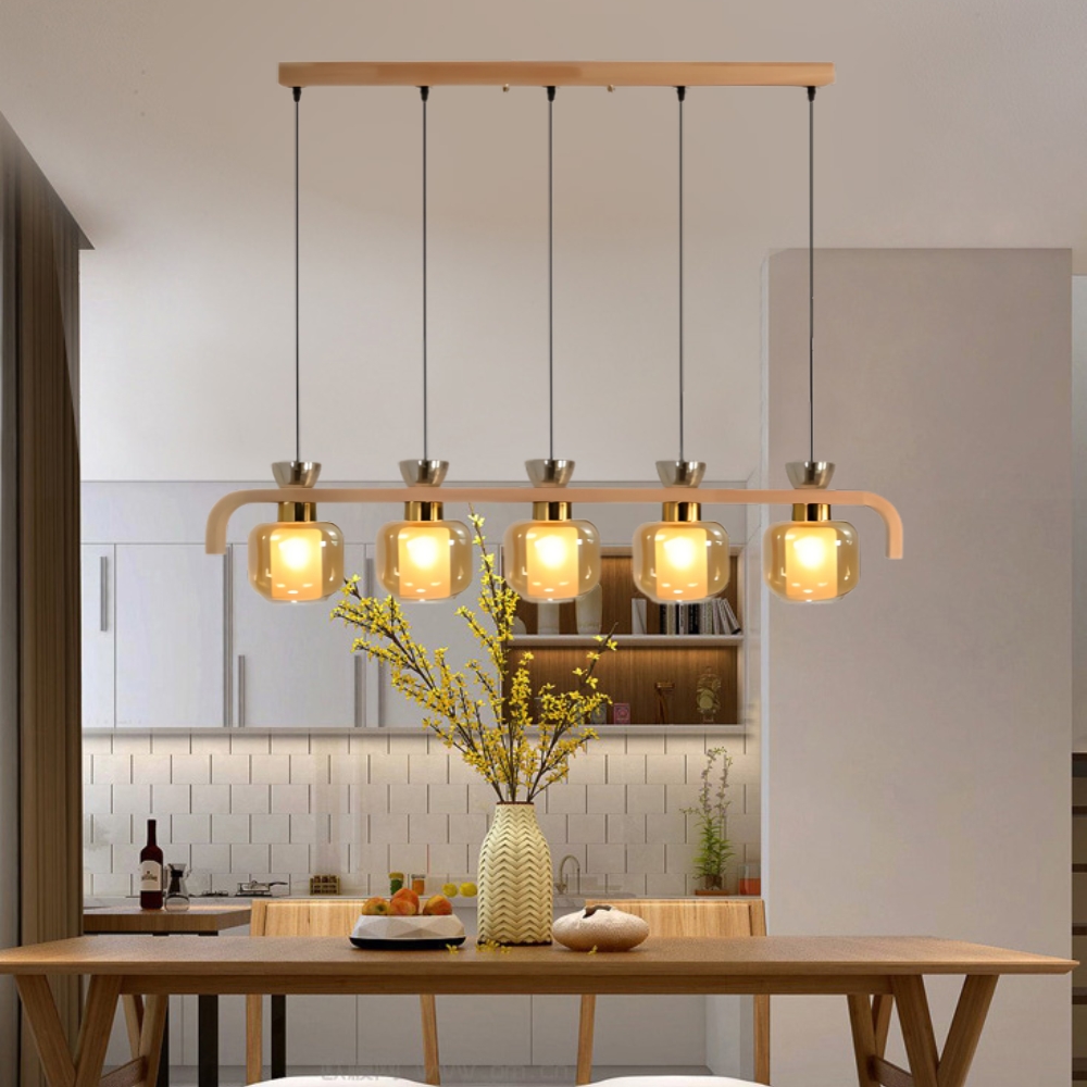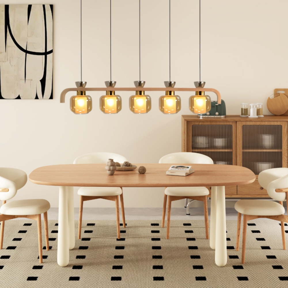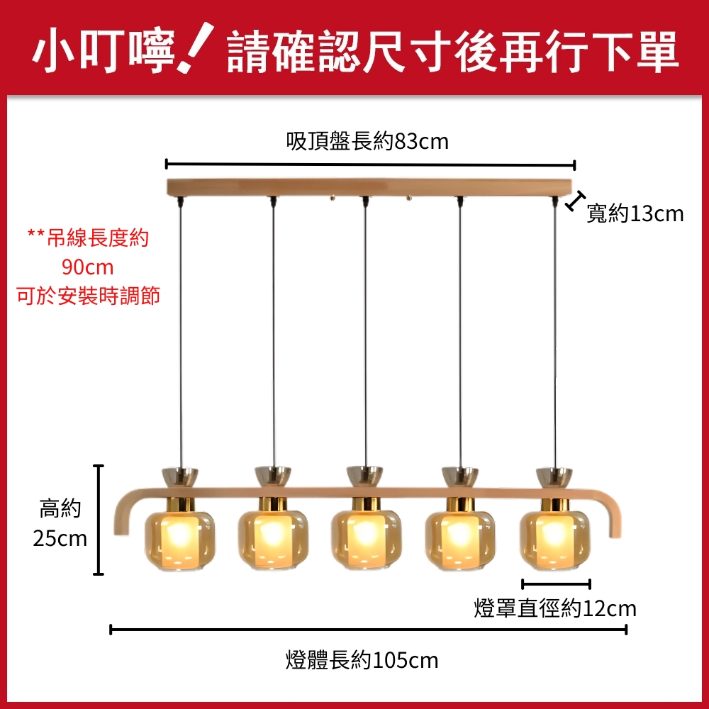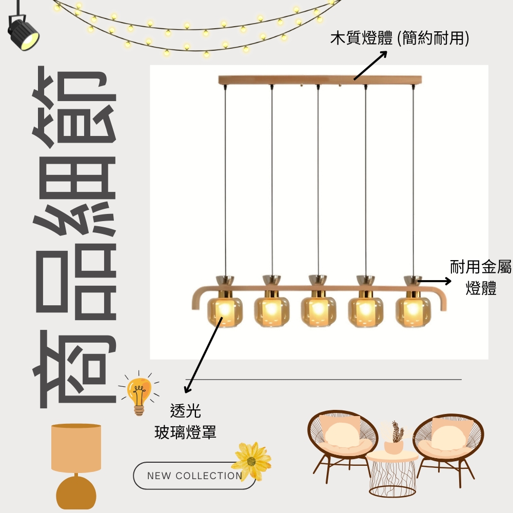 品名 點綴 5 原木/吊燈 材質 金屬/原木燈體 + 玻璃燈罩 尺寸 燈體長約105cm * 高約25cm * 燈罩直徑約12cm 吸頂盤長約83cm * 寬約13cm (附線約90cm 可縮短調整) 光源 需另購E27燈頭燈泡*5 適用 適用約5-6坪