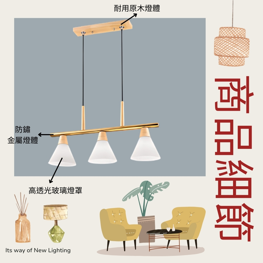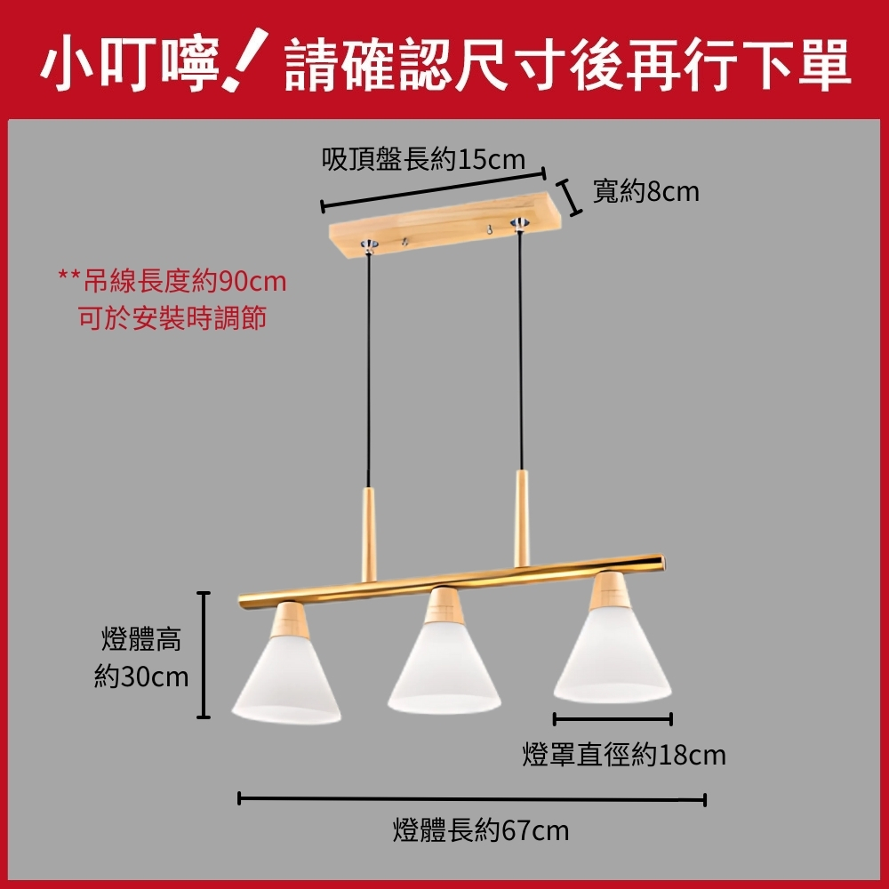 品名 堅持 3 原木/吊燈 材質 金屬/原木燈體 + 玻璃燈罩 尺寸 燈體長約67cm * 高約30cm * 燈罩直徑約18cm 吸頂盤長約15cm * 寬約8cm (附線約90cm 可縮短調整) 光源 需另購E27燈頭燈泡*3 適用 適用約3-4坪