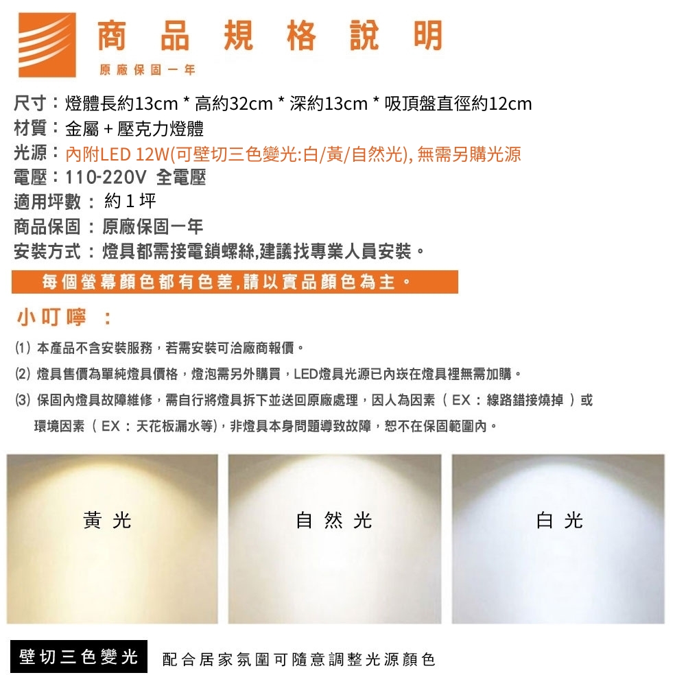 品名 LED 12W 旋律壁燈 (三色光) 材質 金屬 + 壓克力燈體 尺寸 燈體長約13cm * 高度約32cm * 深約13cm 吸頂盤直徑約12cm 光源 內附LED 12W (可壁切三色變光:白/黃/自然光) 適用 適用約1坪