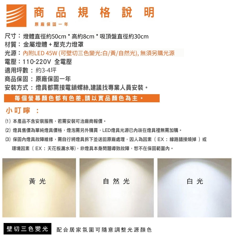 品名 LED 45W 漫步吸頂燈 (三色光)