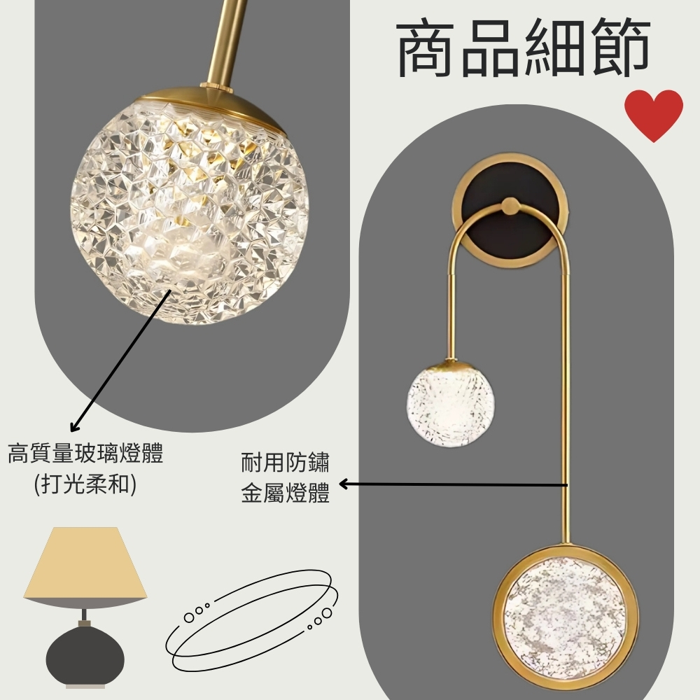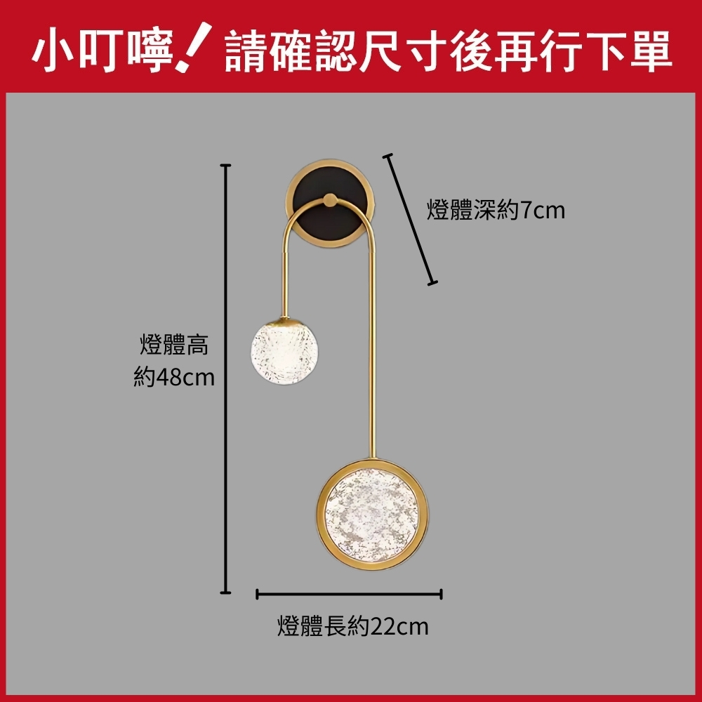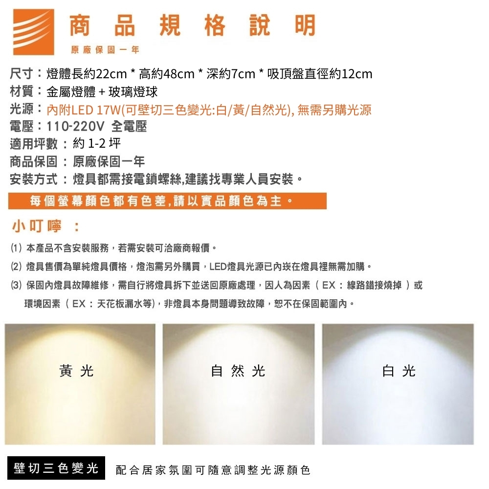 品名 LED 攜伴(三色光)壁燈 (LED 12W+5W) 材質 金屬燈體 + 玻璃燈球 尺寸 燈體長約22m * 高約48cm * 深約7cm 光源 內附LED 17W三色光源 (白/黃/自然光) 適用 約1-2坪