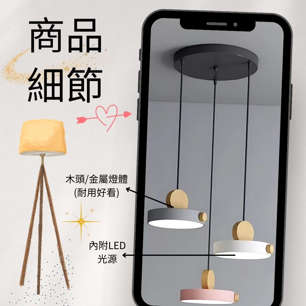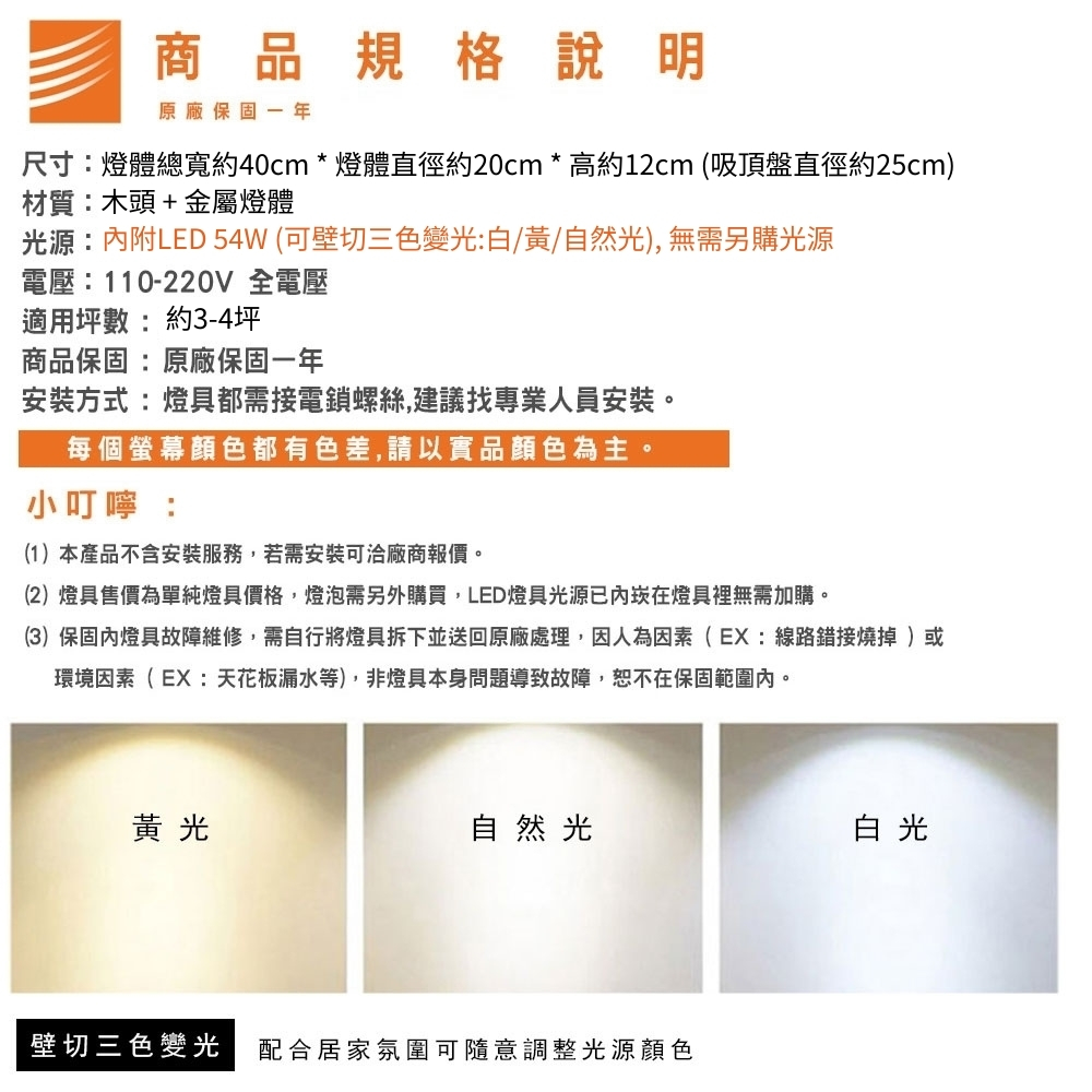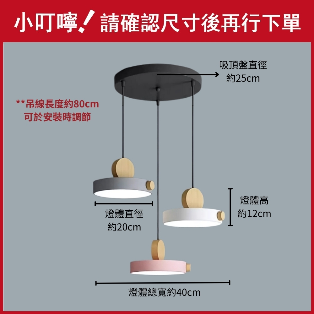 品名 馬卡龍 51號 LED 54W 圓盤 3 吊燈 (三色光) 材質 木頭 + 金屬燈體 尺寸 燈體總寬約40cm * 燈體直徑約20cm *高約12cm 吸頂盤直徑約25cm (附線約80cm 可縮短調整) 光源 內附LED 54W光源 (璧切三色光: 白/黃/自然光) 適用 適用約3-4坪