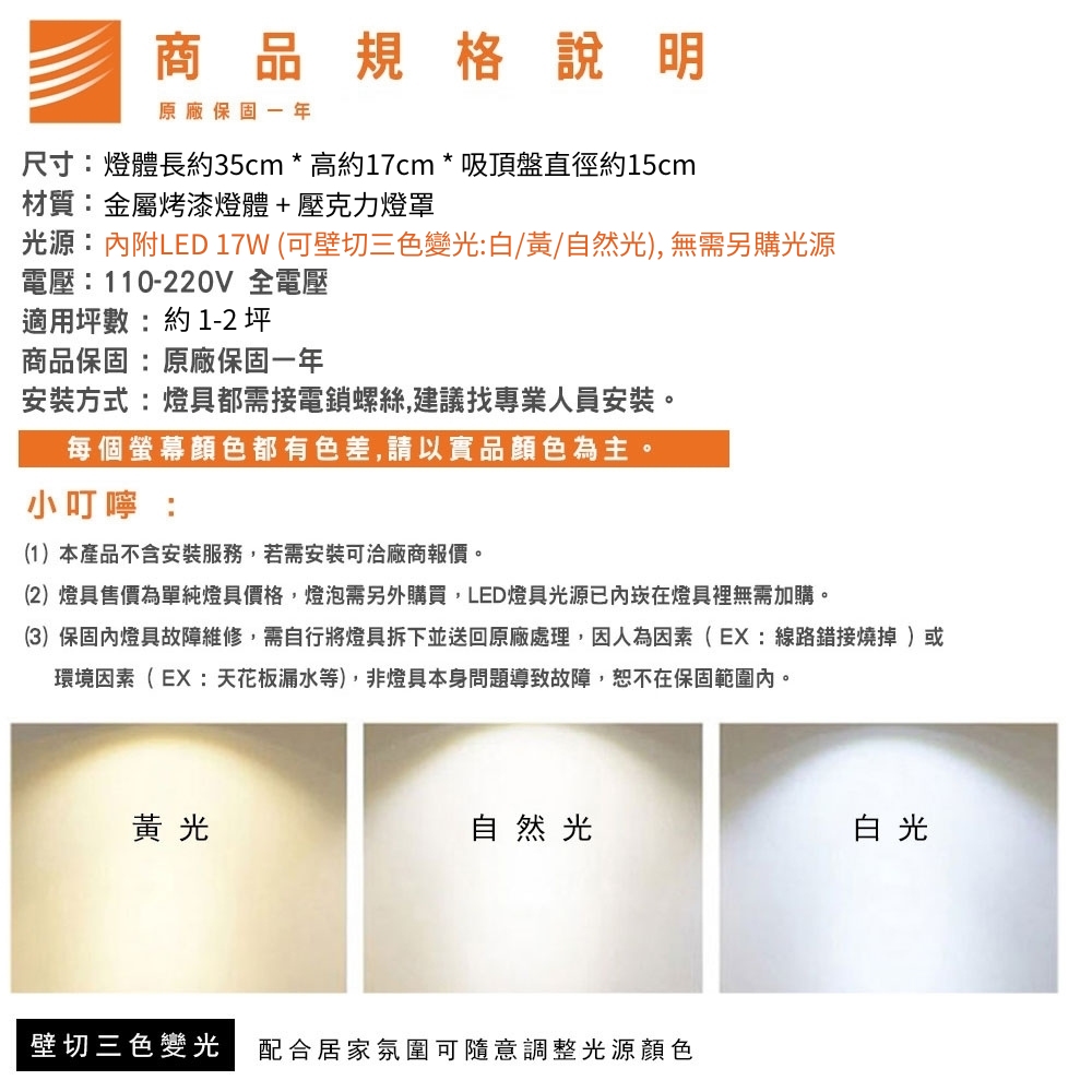 品名 LED 17W 零加一壁燈 (三色光) 材質 金屬烤漆燈體 + 壓克力燈罩 尺寸 燈體長約35m * 高約17cm * 吸頂盤直徑約15cm 光源 內附LED 17W三色光源 (白/黃/自然光) 適用 約1-2坪