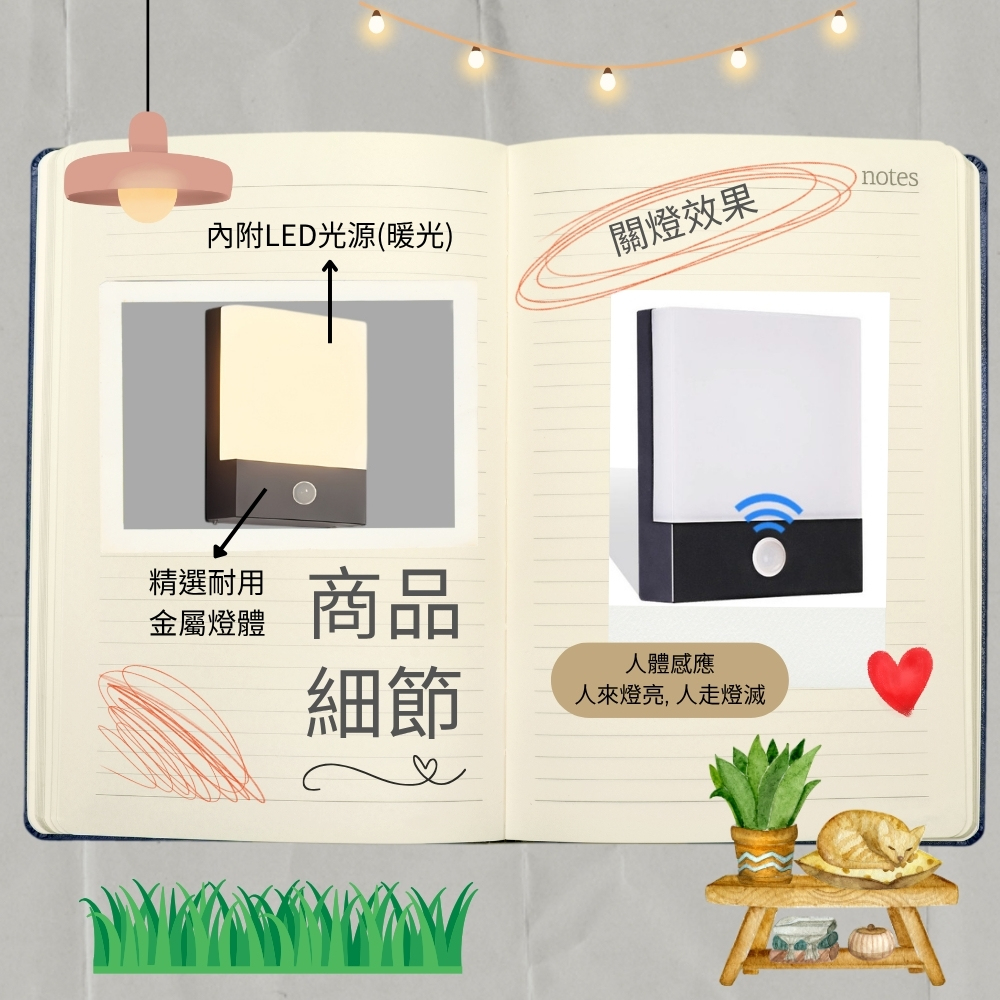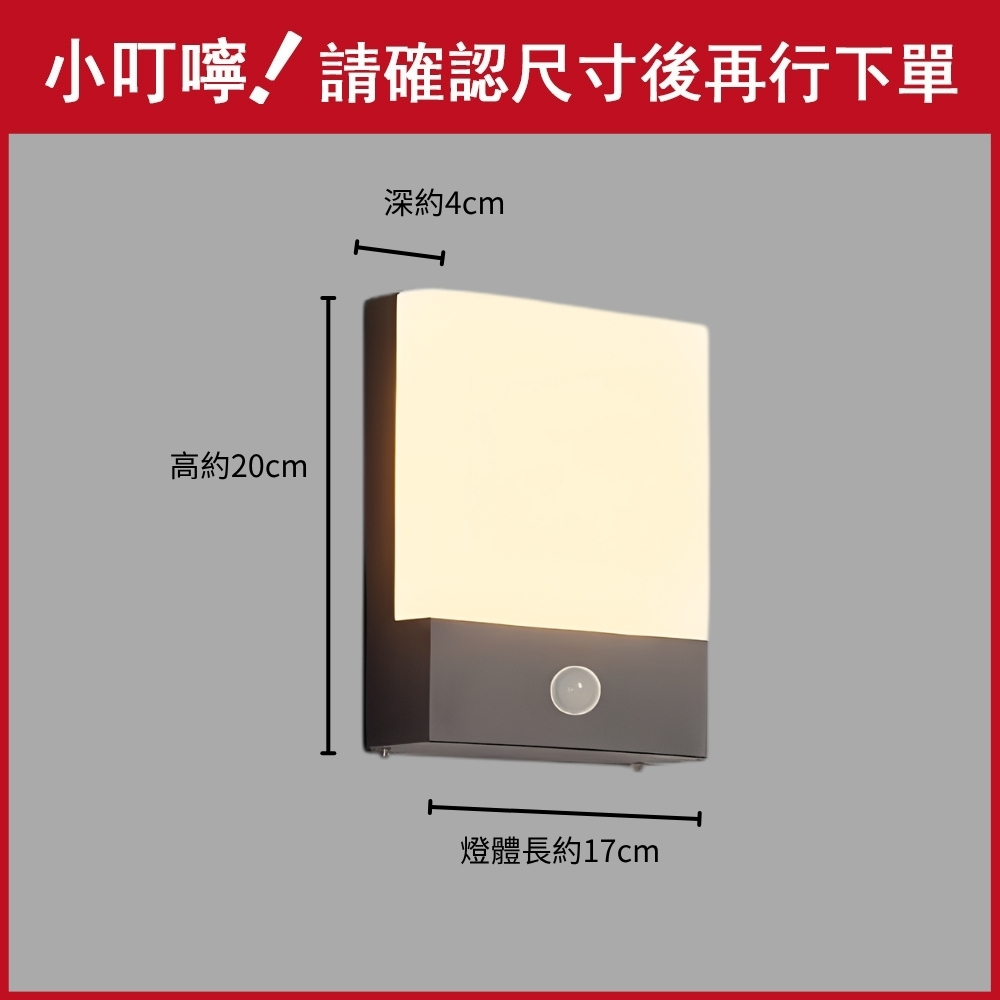 品名 LED 15W 平靜/黃光感應壁燈 (室內/戶外皆適用) 材質 金屬燈體 + 壓克力燈罩 尺寸 燈體長約17cm * 高度約20cm * 深約4cm 光源 內附LED 15W光源 (黃光) 適用 適用約1-2坪